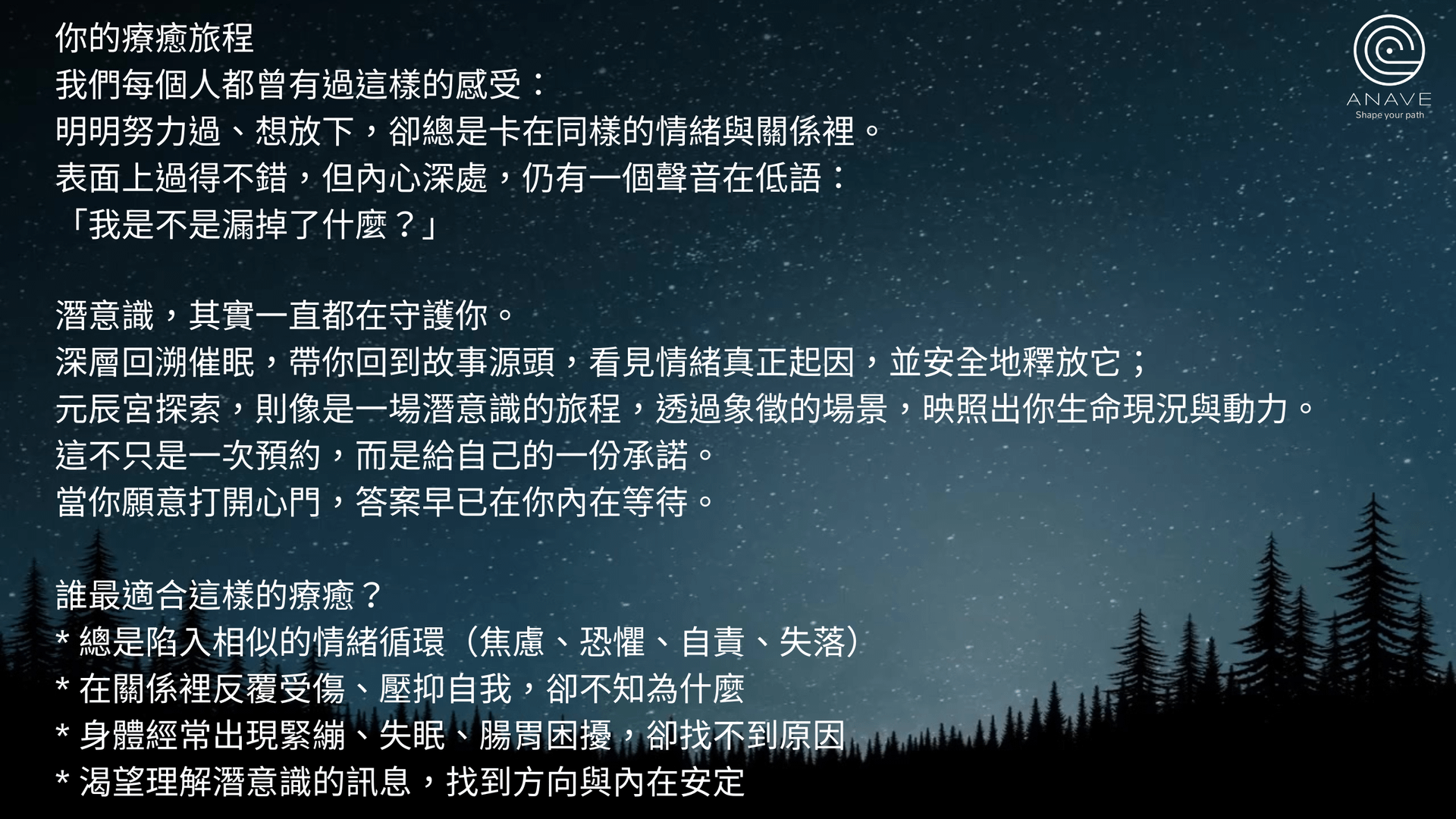無論你正在面臨情緒困擾、關係議題、或人生方向的迷惘,都能在回溯與意識探索中,獲得釋放、理解與新的啟發。