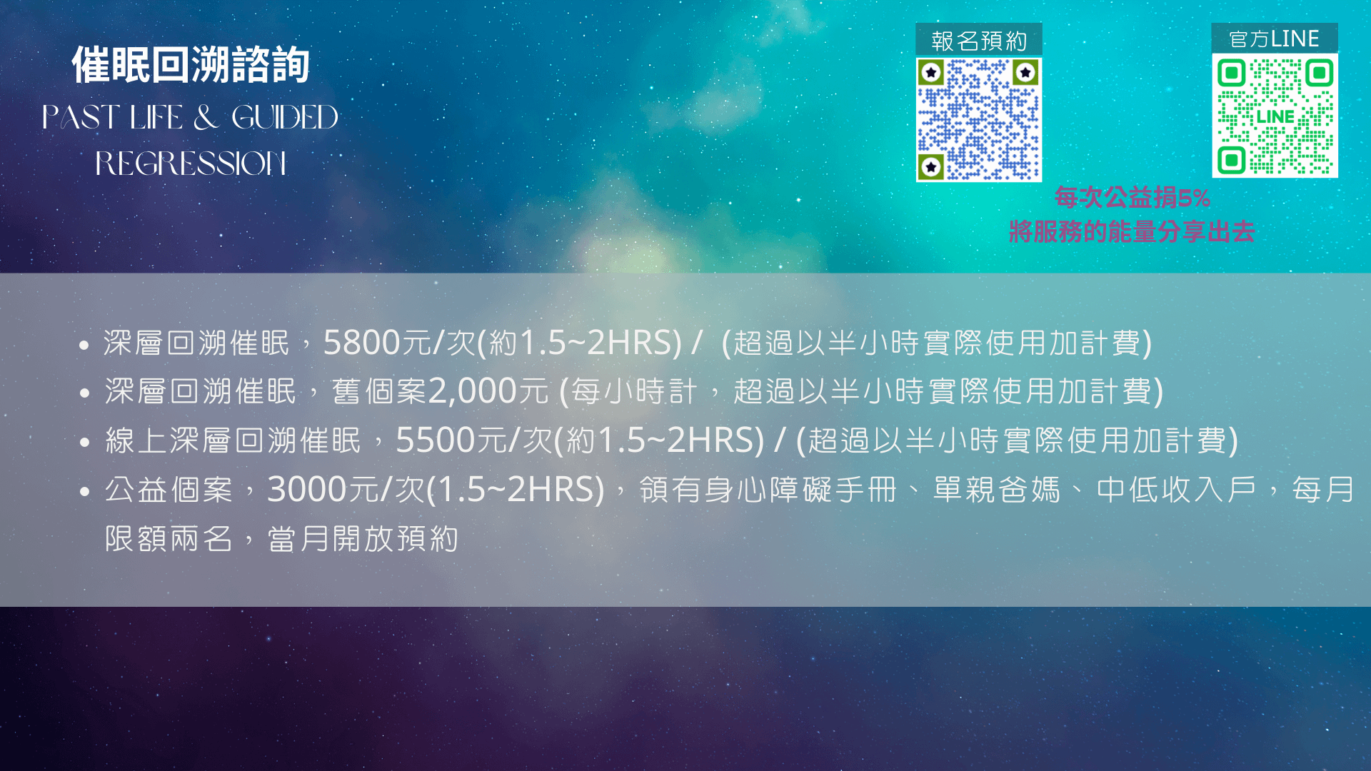 催眠1.5~2hrs,領有身心障礙手冊、單親爸媽、中低收入戶,每月限額兩名,符合資格者有一次使用機會。 報名預約請先填寫預約表單!